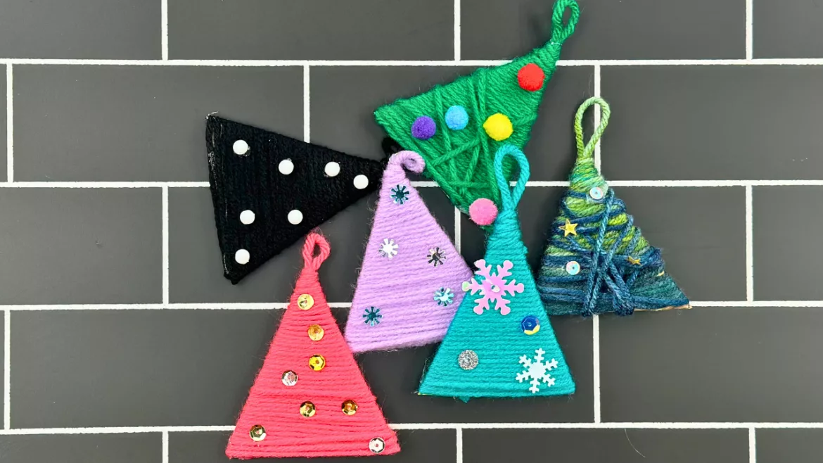 Cut about 6 inches of yarn and fold it in half. Glue it to the top of the triangle