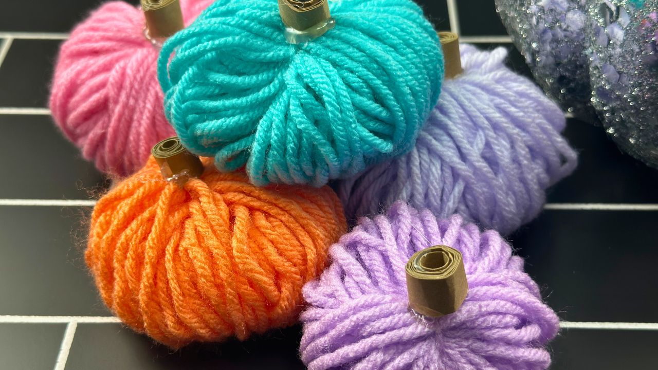 Here’s a great way to use up scrap yarn and create fun little colorful decor for the fall season – simple yarn pumpkins.